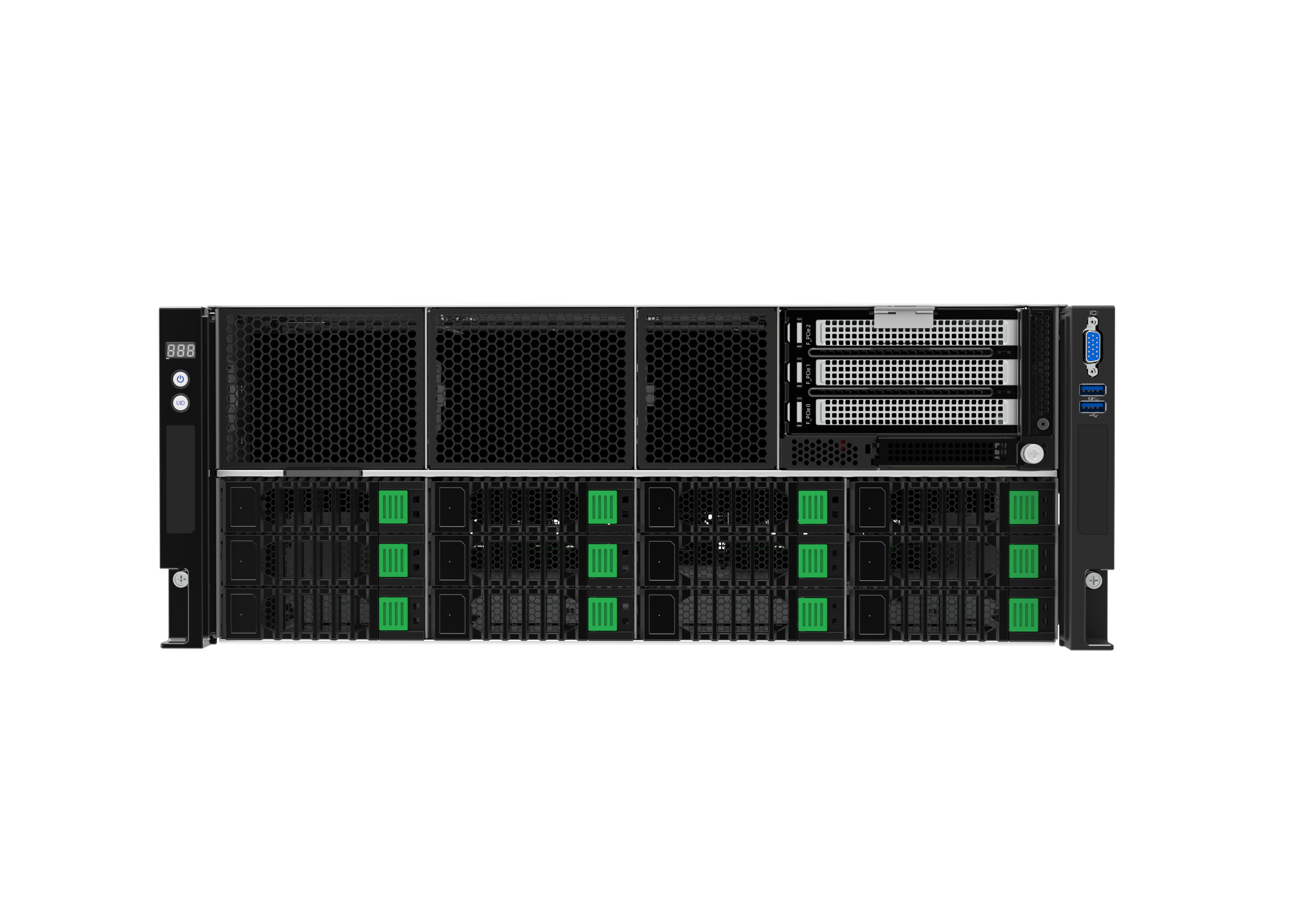 前面板共12个3.5 英寸组合SATA/SAS抽屉。其中4 个NVMe/SATA/SAS抽屉。10个PCIe 5.0X16,以提供更高的带宽和系统升级